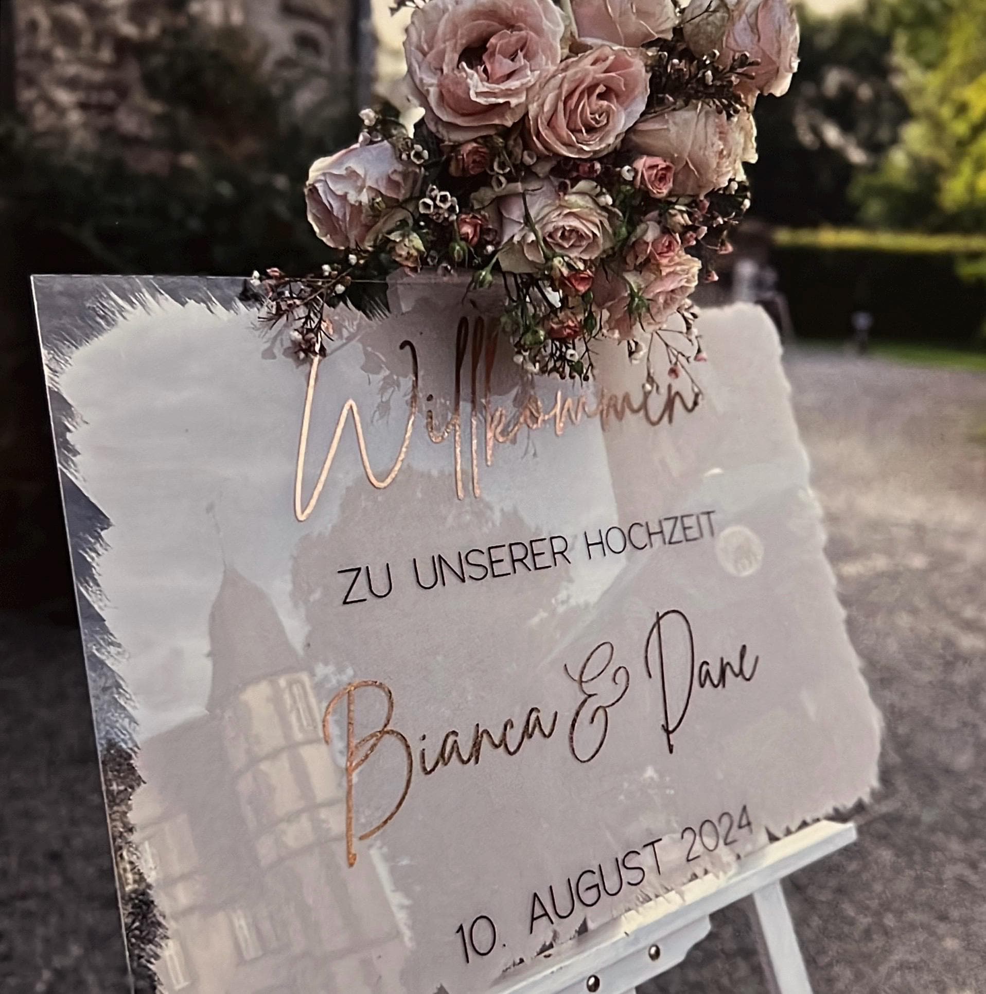 This acrylic sign is the perfect addition to your wedding decoration. The design matches any decoration style and the color selection allows the acrylic sign to be further designed.